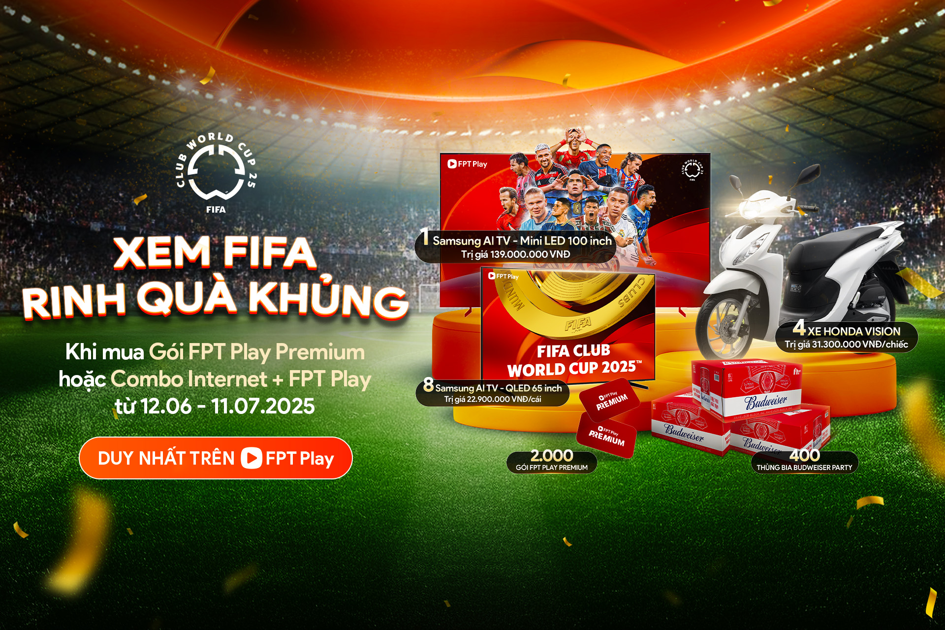 Nhân dịp FIFA Club World Cup 2025™, FPT Play triển khai chương trình khuyến mãi lớn nhất năm mang tên “Xem FIFA – Rinh Quà Khủng” với tổng giá trị giải thưởng lên đến hàng trăm triệu đồng.